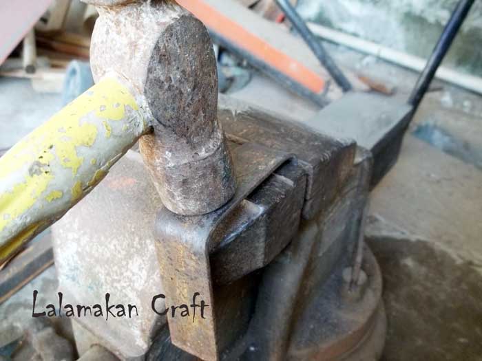 Dengan alat tanggem dan palu plat besi dicengkeram dan dibengkokkan dengan bantuan palu, sebaiknya sih...gunakan kunci khusus untuk membentuk besi plat, tetapi karena di workshop adanya tanggem ya sudah harus memakai yang ini.